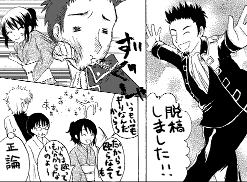 昨日はやってる感が薄いたらなんたらほざいてましたが、2~3ページも貼り終わるともうアナログには戻れねーなと思いました。だって楽なんだ…!アナログと同じ手間かけても画面が全然違って見えちゃうんだぜ!これはもうフォトショップ様々…科学の進歩はすっげえ…!!